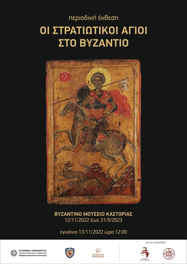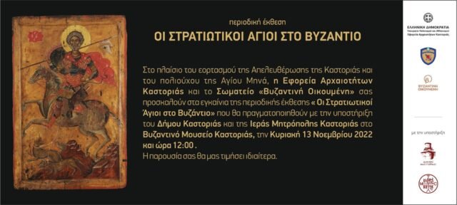 Στο πλαίσιο του εορτασμού της Απελευθέρωσης της Καστοριάς και του πολιούχου της Αγίου Μηνά, η Εφορεία Αρχαιοτήτων Καστοριάς και το Σωματείο Βυζαντινή Οικουμένη σας προσκαλούν στα εγκαίνια της περιοδικής έκθεσης « Οι Στρατιωτικοί Άγιοι στο Βυζάντιο» που θα πραγματοποιηθούν με την υποστήριξη του Δήμου Καστοριάς και της Ιεράς Μητρόπολης Καστοριάς στο Βυζαντινό Μουσείο της πόλης, την Κυριακή 13 Νοεμβρίου 2022 και ώρα 12:00μ.μ.