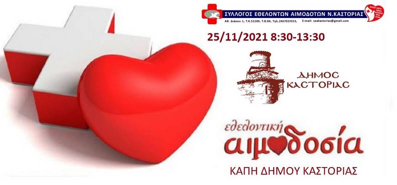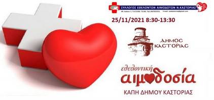 Προκειμένου να καλυφθούν οι πολύ μεγάλες και καθημερινές ανάγκες για αίμα, ο Δήμος Καστοριάς σε συνεργασία με τον Σύλλογο Εθελοντών Αιμοδοτών και το Νοσοκομείο Καστοριάς, θα πραγματοποιήσει την Πέμπτη 25 Νοεμβρίου 2021 εθελοντική αιμοδοσία στον χώρο του ΚΑΠΗ.