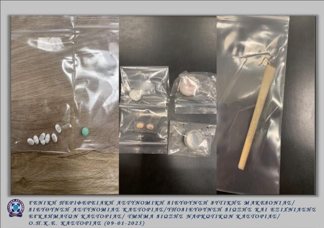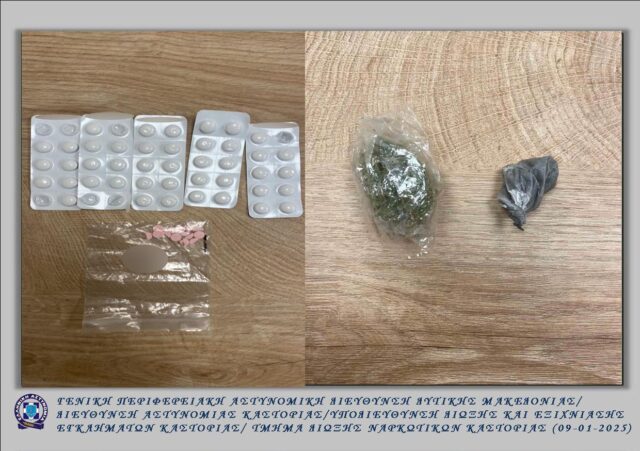 - τις βραδινές ώρες της 07-01-2025 στην ευρύτερη περιοχή της Καστοριάς, από αστυνομικούς του Τμήματος Δίωξης Ναρκωτικών της Υποδιεύθυνσης Δίωξης και Εξιχνίασης Εγκλημάτων Καστοριάς (Υ.Δ.Ε.Ε.), με την συνδρομή του αστυνομικού σκύλου «Ορφέα», συνελήφθησαν -3- ημεδαποί, ηλικίας 23, 25 και 46 ετών, σε δύο διαφορετικές περιπτώσεις, διότι σε ελέγχους που πραγματοποιήθηκαν βρέθηκαν συνολικά στην κατοχή τους και κατασχέθηκαν -3,7- γραμμάρια ακατέργαστης κάνναβης και -48- ναρκωτικά δισκία και -10- τμήματα ναρκωτικών δισκίων, που εμπίπτουν στις διατάξεις του νόμου περί ναρκωτικών, τα οποία ο κάτοχός τους δεν μπόρεσε να δικαιολογήσει.