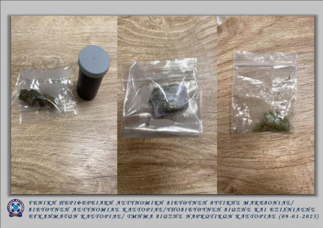 - τις βραδινές ώρες της 05-01-2025 στην ευρύτερη περιοχή της Καστοριάς, συνελήφθη από αστυνομικούς του Τμήματος Δίωξης Ναρκωτικών της Υποδιεύθυνσης Δίωξης και Εξιχνίασης Εγκλημάτων Καστοριάς (Υ.Δ.Ε.Ε.), με την συνδρομή του αστυνομικού σκύλου «Ορφέα», 19χρονος ημεδαπός, διότι σε επισταμένους ελέγχους που πραγματοποιήθηκαν βρέθηκαν στην κατοχή του και κατασχέθηκαν -113,9- γραμμάρια ακατέργαστης κάνναβης και -1- τρίφτης με υπολείμματα κάνναβης. Ακολούθως, την ίδια ημέρα στην πόλη της Καστοριάς συνελήφθη από αστυνομικούς της Ομάδας Πρόληψης και Καταστολής Εγκλήματος (Ο.Π.Κ.Ε.) της Υποδιεύθυνσης Δίωξης και Εξιχνίασης Εγκλημάτων Καστοριάς (Υ.Δ.Ε.Ε.), 35χρονος ημεδαπός, διότι στην κατοχή του βρέθηκε και κατασχέθηκε –1– αυτοσχέδιο τσιγάρο κάνναβης,