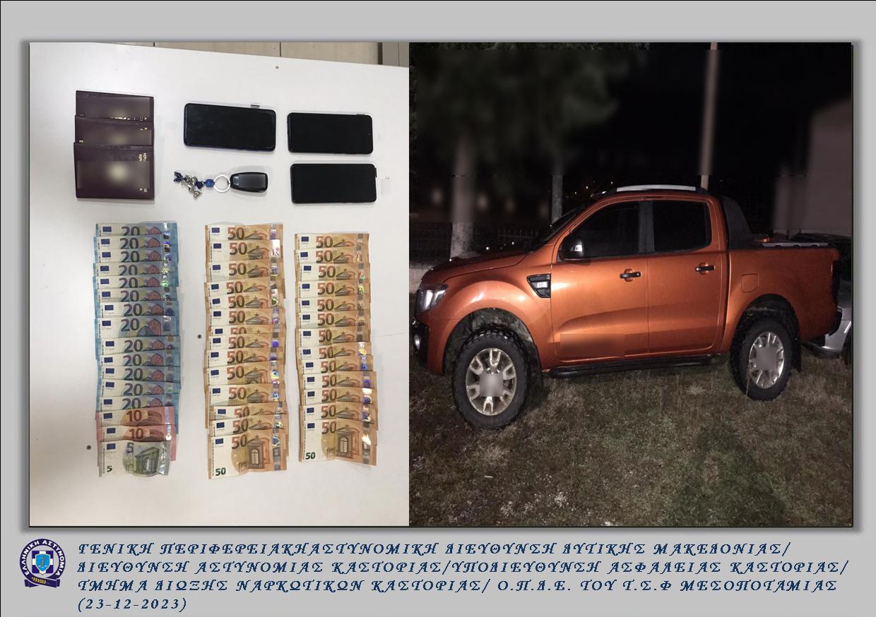Συνελήφθησαν χθες (22-12-2023) τις βραδινές ώρες σε περιοχή της Καστοριάς, από αστυνομικούς της Ομάδας Πάταξης Διασυνοριακού Εγκλήματος (Ο.Π.Δ.Ε.) του Τμήματος Συνοριακής Φύλαξης Μεσοποταμίας και του Τμήματος Δίωξης Ναρκωτικών της Υποδιεύθυνσης Ασφάλειας Καστοριάς, δύο (2) αλλοδαποί, ηλικίας 32 και 51 ετών, για παράνομη μεταφορά αλλοδαπού.