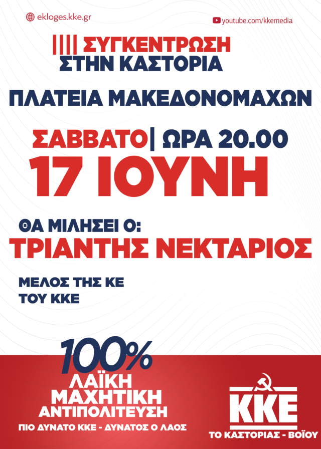 ΚΕΝΤΡΙΚΗ ΠΟΛΙΤΙΚΗ ΣΥΓΚΕΝΤΡΩΣΗ ΚΑΣΤΟΡΙΑΣ του ΚΚΕ. Σάββατο 17 Ιούνη στις 8μμ στην πλατεία Μακεδονομάχων. Σε περίπτωση βροχής η συγκεντρωση θα μεταφερθεί στο ενυδρείο.