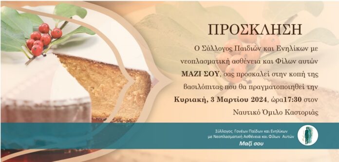 Σας προσκαλεί να συμμετάσχετε στην καθιερωμένη εκδήλωση κοπής της βασιλόπιτας που θα πραγματοποιηθεί την Κυριακή 3 Μαρτίου 2024 και ώρα 5:30 μ.μ.. στον ανακαινισμένο χώρο του ¨ΝΑΥΤΙΚΟΥ ΟΜΙΛΟΥ ΚΑΣΤΟΡΙΑΣ ¨ στην Καστοριά.