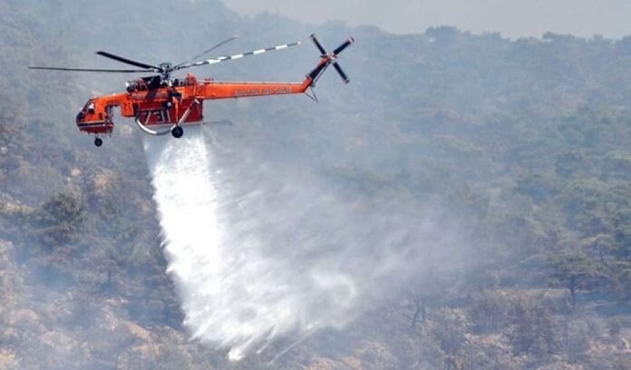 Για την κατάσβεσή της, ενώ από αέρος ρίψεις νερού κάνουν δύο ελικόπτερα.