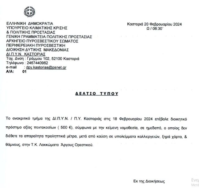 Καστοριά Λακκώματα: Πρόστιμο σε αγρότη από την Πυροσβεστική Υπηρεσία Καστοριάς 20 Φεβρουαρίου 2024 FacebookTwitterPinterestWhatsApp Πρόστιμο σε αγρότη στα Λακκώματα ύψους 500€ επέβαλε η Πυροσβεστική Υπηρεσία Καστοριάς, γιατί δεν διέθετε τα απαραίτητα προληπτικά μέτρα μετά από καύση σε υπολείματα καλλιεργειών. Κοινοποιήστε: Mοιραστείτε στο Facebook(Ανοίγει σε νέο παράθυρο) Facebook Share on X(Ανοίγει σε νέο παράθυρο) X