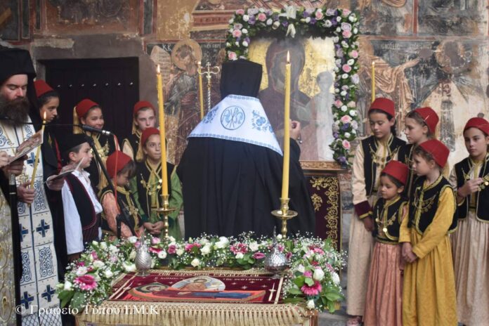 Τελέσαμε τήν Ἀκολουθία τῶν Ἐγκωμίων τῆς Κοιμήσεως τῆς Θεοτόκου, ἐνώπιον τῆς ἱερῆς εἰκόνας τῆς Παναγίας τῆς Πορφύρας, ἐδῶ στό ἱστορικό Μοναστήρι τῆς Παναγίας τῆς Μαυριωτίσσης, σέ ἕνα τόπο πού συνδυάζει τήν ἱστορία μέ τό φυσικό κάλλος τοῦ τοπίου, τό παρελθόν μέ τό παρόν καί μέ τό μέλλον. Στό Μοναστήρι τό ὁποῖο ἀνακαίνισε ὁ Χριστιανός Αὐτοκράτορας τῆς Νέας Ρώμης – Κωνσταντινουπόλεως Ἀλέξιος Κομνηνός, μετά τήν ἀνακατάληψη τῆς πόλης ἀπό τούς Νορμανδούς, τό 1083, μέ τήν βοήθεια τοῦ στρατηγοῦ του Γεωργίου Παλαιολόγου, ὁ ὁποῖος ἀποβιβάστηκε στόν τόπο αὐτό ἐνώπιον τῆς Ἱερᾶς Μονῆς, καί περικύκλωσε τούς Νορμανδούς πού βρίσκονταν μέσα στά τείχη τῆς Καστοριᾶς.