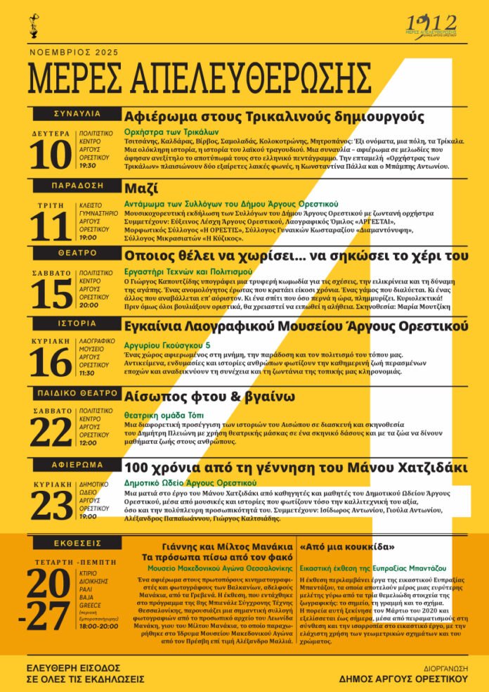 Νοέμβριος στο Άργος Ορεστικό σημαίνει πολιτισμός, ιστορία και συγκίνηση. Κάθε χρόνο, τέτοια εποχή, η πόλη τιμά την επέτειο της Απελευθέρωσής της με έναν θεσμό που εξελίσσεται, εμπλουτίζεται και γίνεται ολοένα πιο αγαπητός.