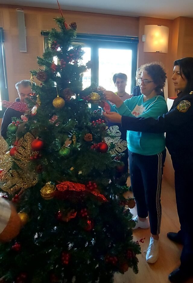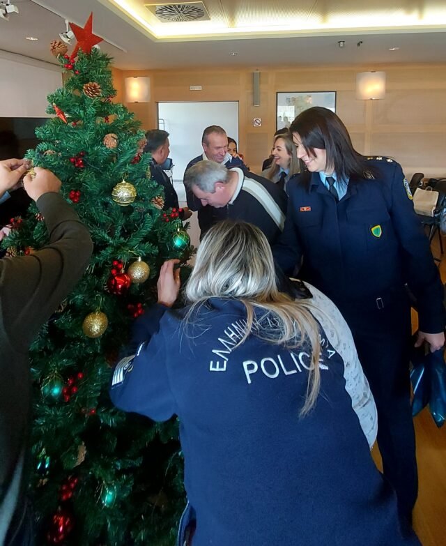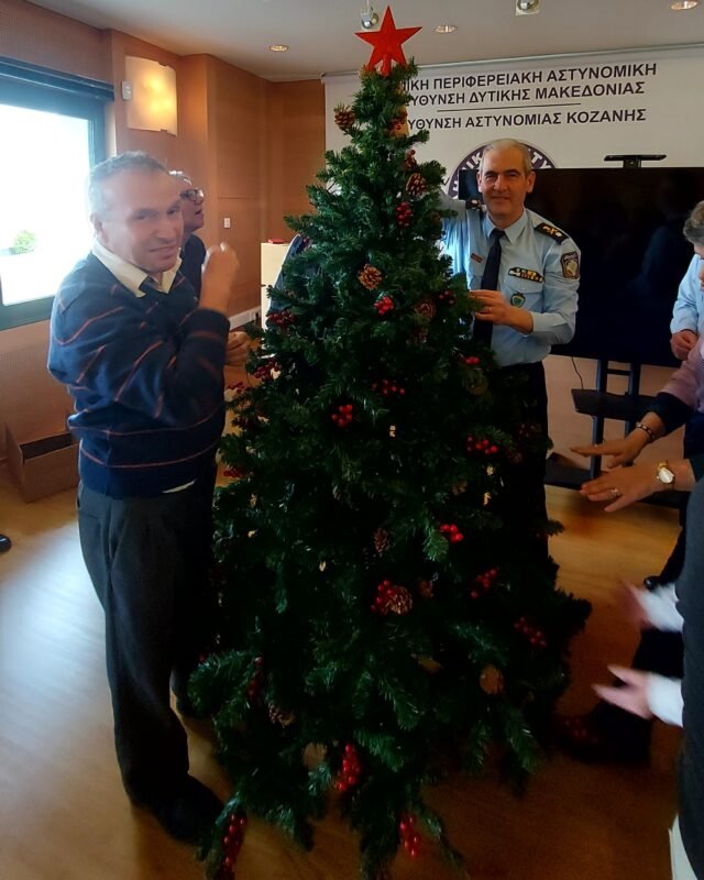 Ακολούθως, ο κ. Γενικός και ο Διευθυντής της Διεύθυνσης Αστυνομίας Κοζάνης, Αστυνομικός Διευθυντής κ. Ηλίας Τσιότσιας από κοινού με τους ωφελούμενους του Ειδικού Εργαστηρίου Κοζάνης στόλισαν φέτος ένα ξεχωριστό χριστουγεννιάτικο δέντρο αγάπης που θα κοσμεί την είσοδο του Αστυνομικού Μεγάρου, ευχόμενοι τη δημιουργία συνθηκών προσβασιμότητας και κοινωνικής ενσωμάτωσης σε έναν κόσμο που θα έχει στη φαρέτρα του ηθικές, κοινωνικές, πνευματικές και ψυχικές αξίες.