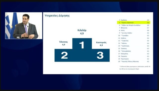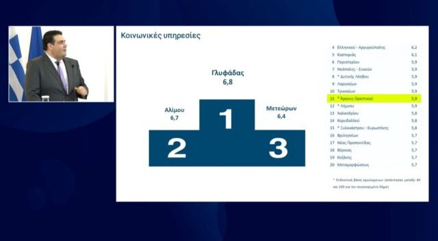 Στην κορυφή της αξιολόγησης δημόσιων υπηρεσιών από τους πολίτες βρέθηκε ο Δήμος Άργους Ορεστικού, σύμφωνα με τα επίσημα αποτελέσματα που παρουσιάστηκαν σήμερα στο Μέγαρο Μαξίμου από τον Υπουργό Εσωτερικών Θεόδωρο Λιβάνιο, παρουσία του Πρωθυπουργού.