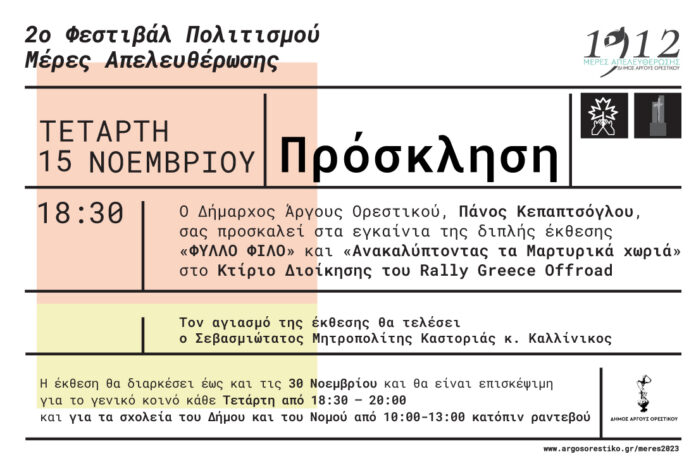 Ο Δήμαρχος Άργους Ορεστικού, Πάνος Κεπαπτσόγλου, σας προσκαλεί στα εγκαίνια της διπλής έκθεσης «ΦΥΛΛΟ ΦΙΛΟ» και «Ανακαλύπτοντας τα Μαρτυρικά χωριά» που θα πραγματοποιηθεί στο Κτίριο Διοίκησης του Rally Greece Offroad, την Τετάρτη 15 Νοεμβρίου και ώρα 18:30.