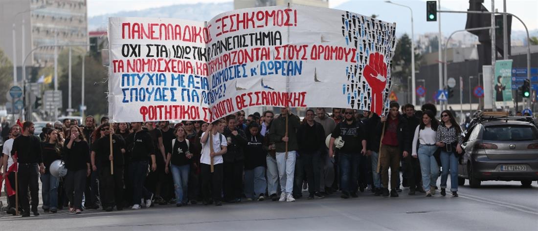 Φοιτητές διαδηλώνουν στο κέντρο της Θεσσαλονίκης, κατά της ίδρυσης μη κρατικών πανεπιστημίων. Νωρίτερα το πρωί φοιτητές απέκλεισαν τις εισόδους του Αριστοτελείου Πανεπιστημίου, όπως μεταφέρει ο ανταποκριτής του ΑΝΤ1 στη Βόρεια Ελλάδα, Βαγγέλης Κοκολάκος.
