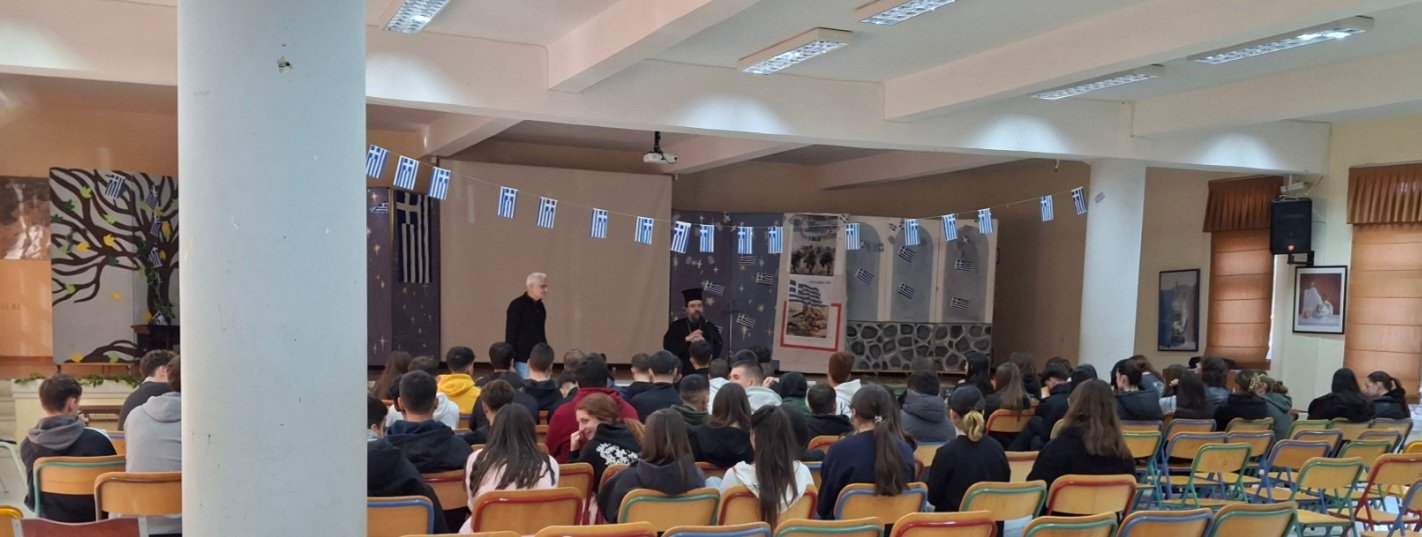 Ὁ Σεβασμιώτατος ἔκανε ἰσάριθμες ὁμιλίες στίς τρεῖς τάξεις τοῦ Λυκείου, πού συγκεντρώθηκαν διαδοχικά στήν αἴθουσα ἐκδηλώσεων τοῦ Σχολείου.