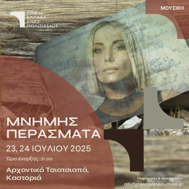 Στον αύλειο χώρο του Αρχοντικού Τσιατσιαπά, στις 23 – 24 Ιουλίου 2025 , ώρα 21.00μμ, θα πραγματοποιηθεί μουσική- οπτικοακουστική παράσταση με τίτλο ” ΜΝΗΜΗΣ ΠΕΡΑΣΜΑΤΑ”, με την στήριξη της Εφορείας Αρχαιοτήτων Καστοριάς και του Δήμου Καστοριάς, στο πλαίσιο των εκδηλώσεων του προγράμματος “Όλη η Ελλάδα – Ένας Πολιτισμός”.