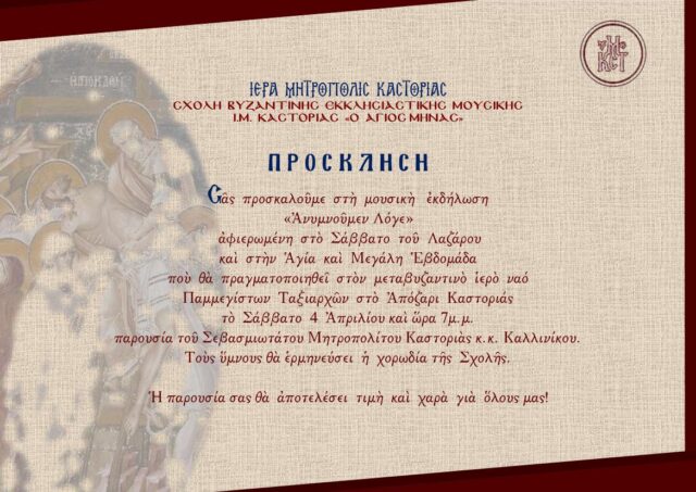 Ἡ Ἱερὰ Μητρόπολη Καστοριὰς διοργανώνει μουσικὴ ἐκδήλωση μὲ τίτλο «Ἀνυμνοῦμεν Λόγε », ἡ ὁποία θὰ πραγματοποιηθεῖ τὸ Σάββατο 4 Ἀπριλίου καὶ ὥρα 19:00 στὸν μεταβυζαντινὸ ἱερὸ ναὸ Παμμεγίστων Ταξιαρχῶν στὸ Ἀπόζαρι Καστοριάς . Ἡ ἐκδήλωση ἀποτελεῖ ἕνα χορωδιακὸ ἀφιέρωμα στὴν Ἀνάσταση τοῦ Λαζάρου καὶ στὰ γεγονότα τῆς Μεγάλης Ἑβδομάδας, ὅπως αὐτὰ ἀποτυπώνονται στὴ λατρευτικὴ ζωὴ τῆς Ἐκκλησίας καὶ στὴ συλλογικὴ μνήμη τοῦ λαοῦ. Ἡ Ἱερὰ Μητρόπολη Καστοριάς , ἀπευθύνει ἀνοιχτὴ πρόσκληση στὸ κοινὸ τῆς πόλης καὶ τῆς εὐρύτερης περιοχῆς νὰ συμμετάσχει σὲ αὐτὴ τὴ μουσικὴ καὶ πνευματικὴ συνάντηση ποὺ θὰ συμβάλει στὴν καλύτερη δυνατὴ προετοιμασία μας γιὰ τὴν βίωση τῶν ὑπερφυῶν γεγονότων τοῦ Θείου Πάθους. Τοὺς ὕμνους καὶ τὰ ἄσματα θὰ ἑρμηνεύσει ἡ χορωδία τῆς Σχολῆς Βυζαντινῆς Ἐκκλησιαστικῆς Μουσικῆς τῆς Ἱερᾶς Μητροπόλεως Καστοριὰς ὁ Ἅγιος Μηνὰς» ὑπὸ τὴ διεύθυνση τοῦ πρωτοψάλτου κ. Γεωργίου Ἀποστολίδη. Παρουσίαση καὶ ἀφήγηση κ. Μαρία Παπαζήση .