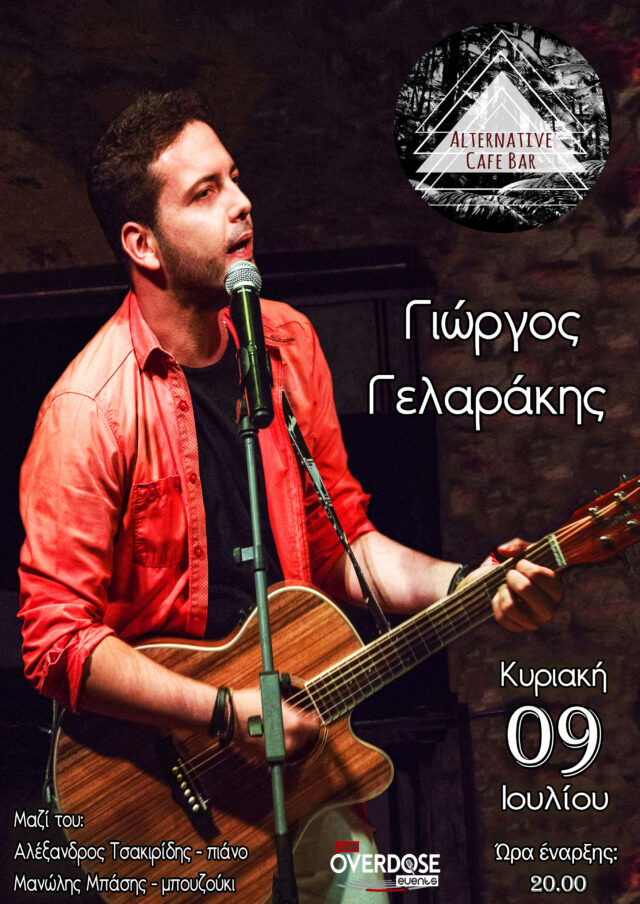 Ο Γιώργος Γελαράκης στα πλαίσια της καλοκαιρινής του περιοδείας, έρχεται στον υπέροχο υπαίθριο χώρο του ” Alternative Cafe bar“, και μας καλεί σε μια μουσική βραδιά με αμεσότητα, με πολύ ρυθμό, με τις πιο χαρακτηριστικές πινελιές της ελληνικής δισκογραφίας, στιγμές από το χτες και το σήμερα με σκοπό να τραγουδήσουμε όλοι μαζί και να γίνουμε μια παρέα!