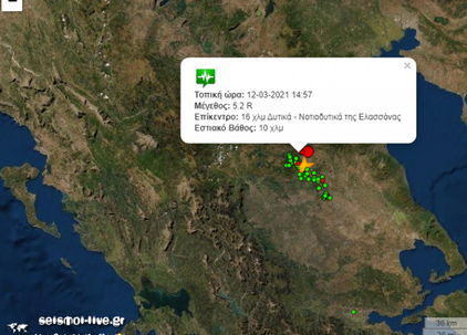 Επικαιρότητα Νέος μεγάλος σεισμός πριν λίγο στην Ελασσόνα – Αισθητός στην Καστοριά 12 Μαρτίου 2021 FacebookTwitterPinterestWhatsApp Νέα ισχυρή σεισμική δόνηση μεγέθους 5,2 ρίχτερ σημειώθηκε στις 14:57 στην Ελασσόνα. Το επίκεντρο ήταν 16 χλμ Δυτικά – Νοτιοδυτικά της Ελασσόνας. Το εστιακό βάθος ήταν 10 χλμ. Ο σεισμός έγινε ιδιαίτερα αισθητός στην Καστοριά. Κοινοποιήστε: Mοιραστείτε στο Facebook(Ανοίγει σε νέο παράθυρο) Facebook Share on X(Ανοίγει σε νέο παράθυρο) X