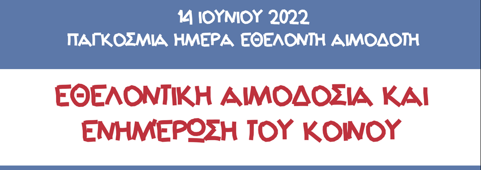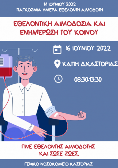 Η Υπηρεσία Αιμοδοσίας του Γενικού Νοσοκομείου Καστοριάς, διοργανώνει και σας προσκαλεί στην εκδήλωση που θα πραγματοποιηθεί με αφορμή τον Εορτασμό της Παγκόσμιας Ημέρας Εθελοντή Αιμοδότη, στις 16 Ιουνίου 2022 στην αίθουσα του ΚΑΠΗ του Δήμου Καστοριάς και ώρα 8:30- 13:30 , όπου θα διεξαχθεί Εθελοντική Αιμοδοσία και ενημέρωση του κοινού.