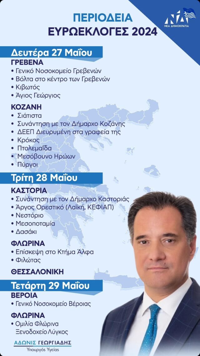 Σας γνωστοποιούμε ότι την Τρίτη 28 Μαΐου 2024 θα επισκεφθεί την ΠΕ Καστοριας ο Υπουργός Υγείας και Αντιπρόεδρος της Νέας Δημοκρατίας κ.Αδωνις Γεωργιαδης.