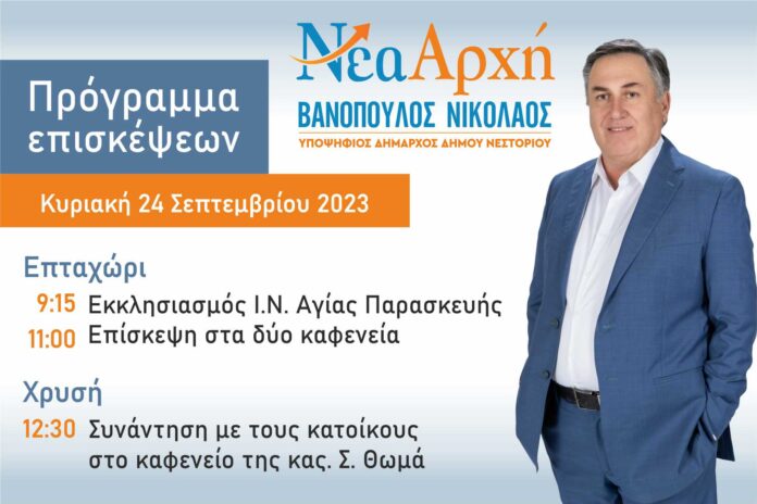 ΚαστοριάΝεστόριοΕλλάδαΠολιτική Ο Νίκος Βανόπουλος συναντά τους πολίτες. Πρόγραμμα επισκέψεων την Κυριακή 24 Σεπτεμβρίου 21 Σεπτεμβρίου 2023 FacebookTwitterPinterestWhatsApp Πρόγραμμα επισκέψεων του υποψήφιου Δημάρχου Νεστορίου την Κυριακή 24 Σεπτεμβρίου 2023 Επταχώρι 9:15 Εκκλησιασμός Ι.Ν. Αγίας Παρασκευής 11:00 Επίσκεψη στα δύο καφενεία Χρυσή: 12:30 Συνάντηση με τους κατοίκους στο καφενείο της κας. Σ. Θωμά Κοινοποιήστε: Mοιραστείτε στο Facebook(Ανοίγει σε νέο παράθυρο) Facebook Share on X(Ανοίγει σε νέο παράθυρο) X