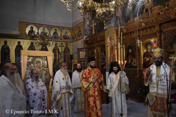 Πρίν ἀπό τήν Σύναξη, προηγήθηκε ἡ Θεία Λειτουργία στήν ὁποία χοροστάτησε ὁ Σεβασμιώτατος καί τήν ὁποία τέλεσε ὁ ἱερομόναχος π. Σεραφείμ Στογιάννος μαζί μέ τόν διάκονο π. Γεώργιο Ἀνδρεάδη.