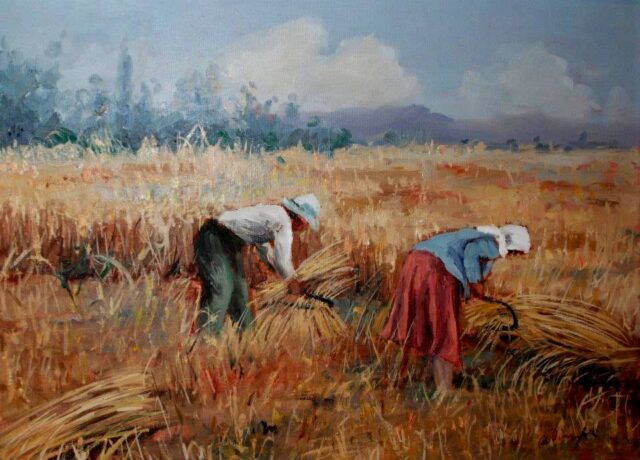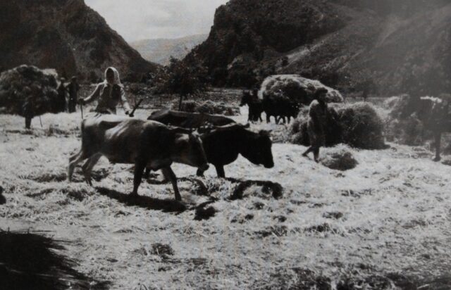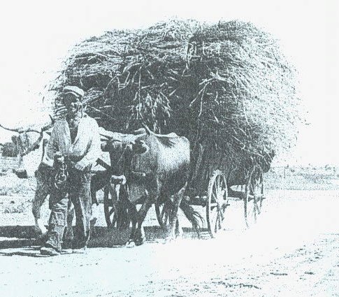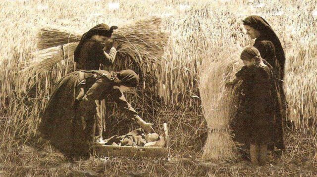 Λίγο πιο πίσω ακολουθούσαν αυτοί που μάζευαν τα κομμένα στάχια και αφού τα έδεναν σε δεμάτια, τα μετέφεραν με τα κάρα στα αλώνια.