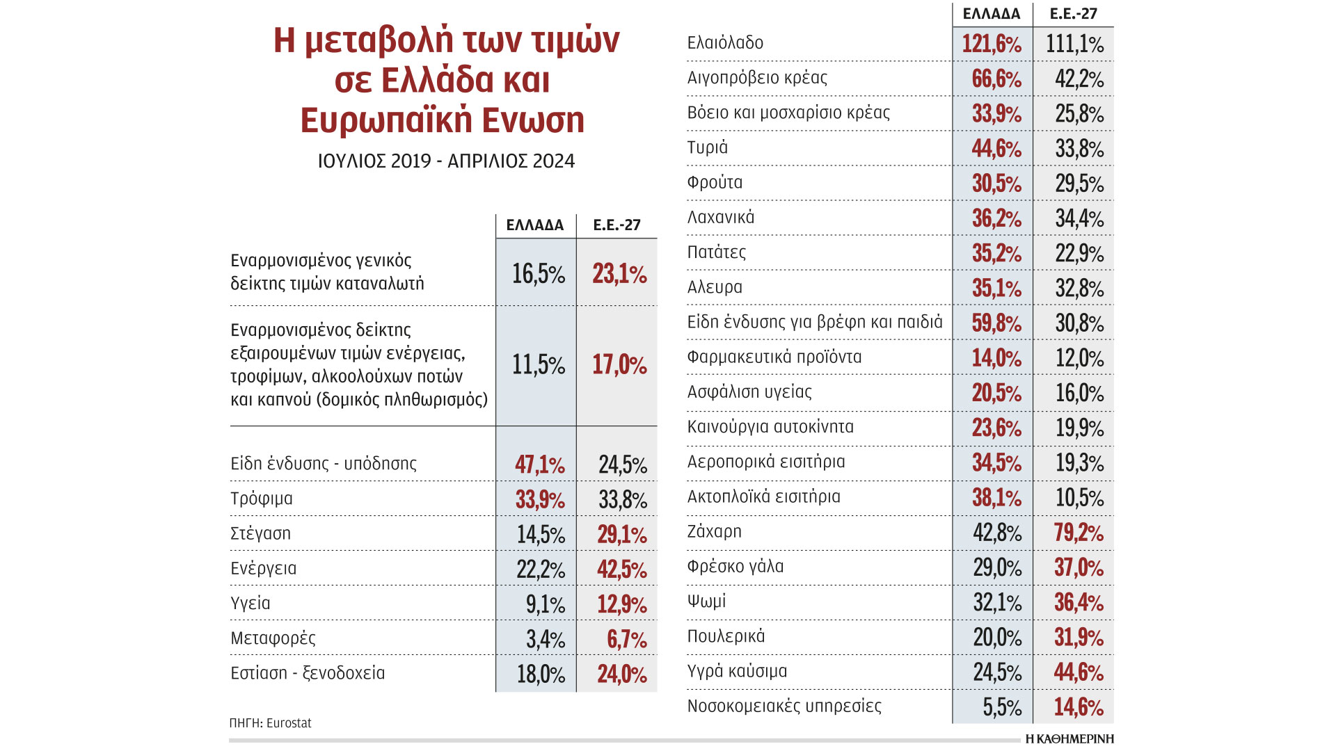 Σύμφωνα, λοιπόν, με τα αναλυτικά στοιχεία της Eurostat για την εξέλιξη των τιμών την περίοδο Ιουλίου 2019 – Απριλίου 2024, ο εναρμονισμένος δείκτης τιμών καταναλωτή αυξήθηκε κατά 16,5% στην Ελλάδα έναντι 23,1% στην Ε.Ε. Ειδικά οι τιμές των τροφίμων, κατηγορία η οποία βρίσκεται στο επίκεντρο τα 2,5 τελευταία χρόνια, αυξήθηκαν στην Ελλάδα την περίοδο 2019-2024 κατά 33,9%, όσο περίπου και στην Ε.Ε. (33,8%).