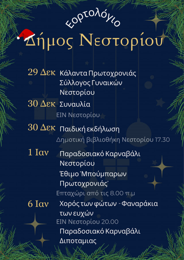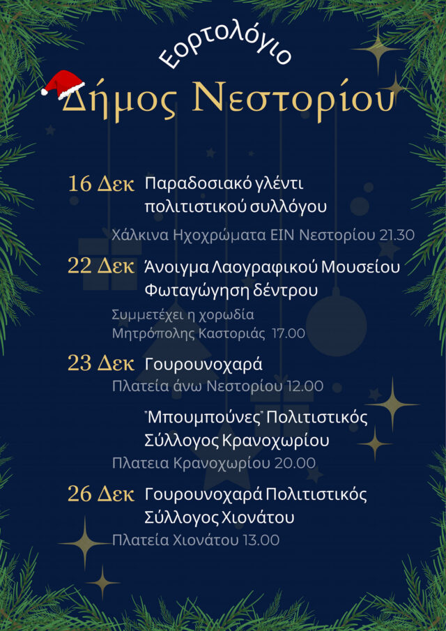 ΚαστοριάΕκδηλώσειςΝεστόριο Οι Χριστουγεννιάτικες εκδηλώσεις στον Δήμο Νεστορίου 13 Δεκεμβρίου 2023 FacebookTwitterPinterestWhatsApp Σας προσκαλούμε στο φετινό μας πλούσιο εορταστικό πρόγραμμα! Είστε όλοι ευπρόσδεκτοι και θα χαρούμε ιδιαίτερα να ανταμώσουμε στις εκδηλώσεις μας, να χορέψουμε να τραγουδήσουμε και να διασκεδάσουμε! Καλές γιορτές σε όλους με υγεία! Κοινοποιήστε: Mοιραστείτε στο Facebook(Ανοίγει σε νέο παράθυρο) Facebook Share on X(Ανοίγει σε νέο παράθυρο) X