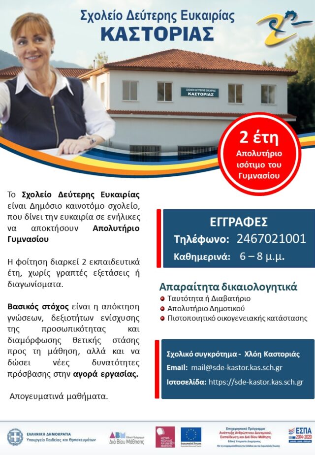 Εάν είσαι άνω των 18 ετών και χρειάζεσαι Απολυτήριο Γυμνασίου για επαγγελματική κατοχύρωση και αναβάθμιση των σπουδών σου, αλλά και γιατί το έχεις μεράκι και θέλεις να νιώσεις τη χαρά της γνώσης, έλα στο Σχολείο Δεύτερης Ευκαιρίας Καστοριάς!