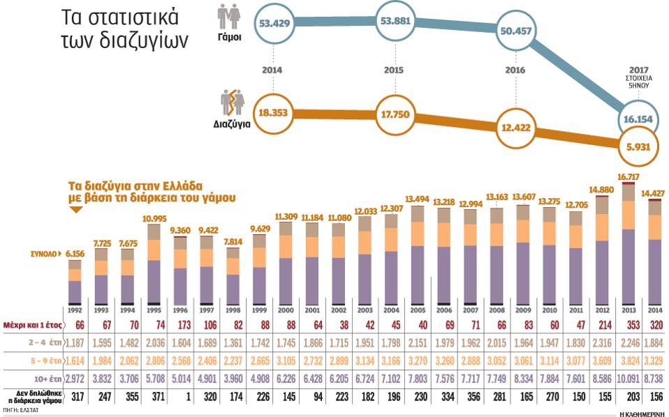 Οι στατιστικές του υπουργείου Εσωτερικών αποτυπώνουν μείωση στον αριθμό των διαζυγίων κατά τη διάρκεια των μνημονιακών ετών. Από 18.353 που ήταν οι χωρισμοί κατά τη διάρκεια του 2014, περιορίστηκαν σε 17.750 το 2015, και σε μόλις 12.422 κατά τη διάρκεια του 2016. Οσον αφορά στο πρώτο πεντάμηνο του 2017, τα διαζύγια ανέρχονται προς το παρόν σε 5.931, με τους γάμους για την ίδια περίοδο να ανέρχονται σε 16.154. Η μείωση που αποτυπώνεται στη στατιστική του ηλεκτρονικού ληξιαρχείου έχει την εξήγησή της, όπως υποστηρίζουν οι ειδικοί. Αν και δεν υπάρχουν σχετικά στατιστικά να υποστηρίξουν τη σχετική επιχειρηματολογία –δεν θα μπορούσαν, άλλωστε, καθώς τους λόγους των διαζυγίων τους γνωρίζουν μόνο οι άμεσα εμπλεκόμενοι– γίνεται ο εξής διαχωρισμός: