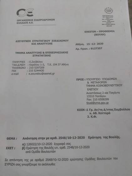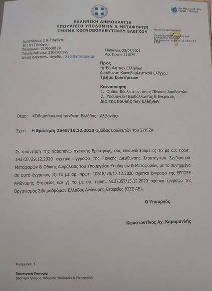 Σήμερα διαψεύδονται από τον ίδιο τον Υπουργό Μεταφορών και Υποδομών κ. Κώστα Καραμανλή με την επίσημη απάντησή του σε κοινοβουλευτική ερώτηση που καταθέσαμε στις 11 Δεκεμβρίου 2020 με θέμα τη «Σιδηροδρομική Σύνδεση Ελλάδας – Αλβανίας». Στην επίσημη απάντηση στον κοινοβουλευτικό έλεγχο το Υπουργείο Υποδομών παραθέτει επίσης τα επίσημα στοιχεία του ΟΣΕ και της ΕΡΓΟΣΕ.