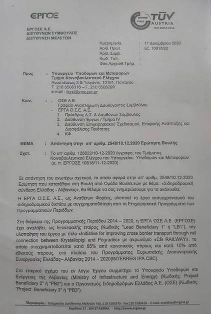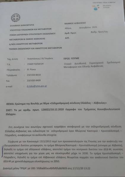 Πιο συγκεκριμένα σύμφωνα με το Υπουργείο Υποδομών και Μεταφορών με το έγγραφο αρ. πρωτ. 133031/ 17-12-2020 «το τμήμα Φλώρινα/Καστοριά – Κρυσταλλοπηγή (σύνορα με Αλβανία), δηλαδή το τμήμα επί ελληνικού εδάφους, αποτελεί τμήμα του κεντρικού δικτύου του ΔΕΔ-Μ, συνεπώς αποτελεί υποχρέωση για την χώρα μας να ολοκληρωθεί μέχρι το 2030.» Επίσης στην απάντηση αναφέρεται «Όσον αφορά στα θέματα που θίγονται στο ερώτημα που κατατέθηκε στη Βουλή για το έργο της σιδηροδρομικής σύνδεσης Ελλάδας – Αλβανίας, δεν έχει περιέλθει στην υπηρεσία μας σχετική ενημέρωση που να αφορά σε οποιαδήποτε πιθανή αλλαγή του χρονοδιαγράμματος ή του ελληνικού τμήματος του έργου.»