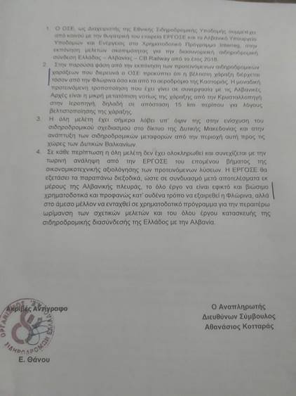 Σύμφωνα με το έγγραφο αρ. πρωτ. 9127357/ 15-12-2020 του ΟΣΕ για το συγκεκριμένο έργο σημειώνεται πως για τη σύνδεση Ελλάδας – Αλβανίας «η βέλτιστη χάραξη διέρχεται τόσον από τη Φλώρινα όσο και από το αεροδρόμιο Καστοριάς» και «το όλο έργο είναι εφικτό και βιώσιμο χρηματοδοτικά.»