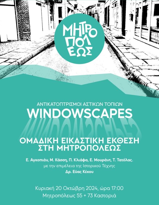 Κυριακή 20 Οκτωβρίου 2024Από τις 20 Οκτωβρίου έως τις 24 Μαΐου η εθελοντική πρωτοβουλία «Μητροπόλεως» παρουσιάζει την ομαδική εικαστική έκθεση “Windowscapes” που θα πραγματοποιηθεί στις βιτρίνες της οδού Μητροπόλεως σε επιμέλεια της ιστορικού τέχνης και ανεξάρτητης επιμελήτριας δρ. Εύας Κέκου.
