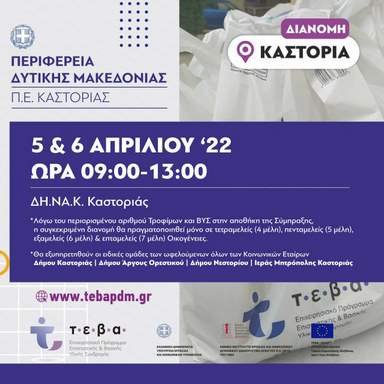 - Την Τρίτη 5 Απριλίου 2022 & Τετάρτη 6 Απριλίου 2022, από τις 9:00π.μ – 13:00μ.μ στο σημείο ΔΗ.ΝΑ.Κ. Καστοριάς, όπου θα εξυπηρετηθούν οι ειδικές ομάδες των ωφελούμενων όλων των Κοινωνικών Εταίρων (Δήμου Καστοριάς – Δήμου Άργους Ορεστικού – Δήμου Νεστορίου και της Ιεράς Μητρόπολης Καστοριάς).