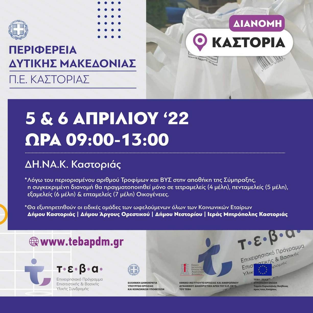 Η Περιφερειακή Ενότητα Καστοριάς ως επικεφαλής εταίρος της Κοινωνικής Σύμπραξης ΤΕΒΑ που έχει συσταθεί για το Νομό μας, ανακοινώνει ότι 5 & 6 Απριλίου 2022 θα πραγματοποιηθεί ειδική διανομή τροφίμων του «Επιχειρησιακού Προγράμματος Επισιτιστικής και Βασικής Υλικής Συνδρομής ΤΕΒΑ 2018-2019». Λόγω του περιορισμένου αριθμού Τροφίμων και ΒΥΣ στην αποθήκη της Σύμπραξης, η συγκεκριμένη διανομή θα πραγματοποιηθεί μόνο σε τετραμελείς (4 μέλη) – πενταμελείς (5 μέλη) – εξαμελείς (6 μέλη) & επταμελείς (7 μέλη) Οικογένειες.