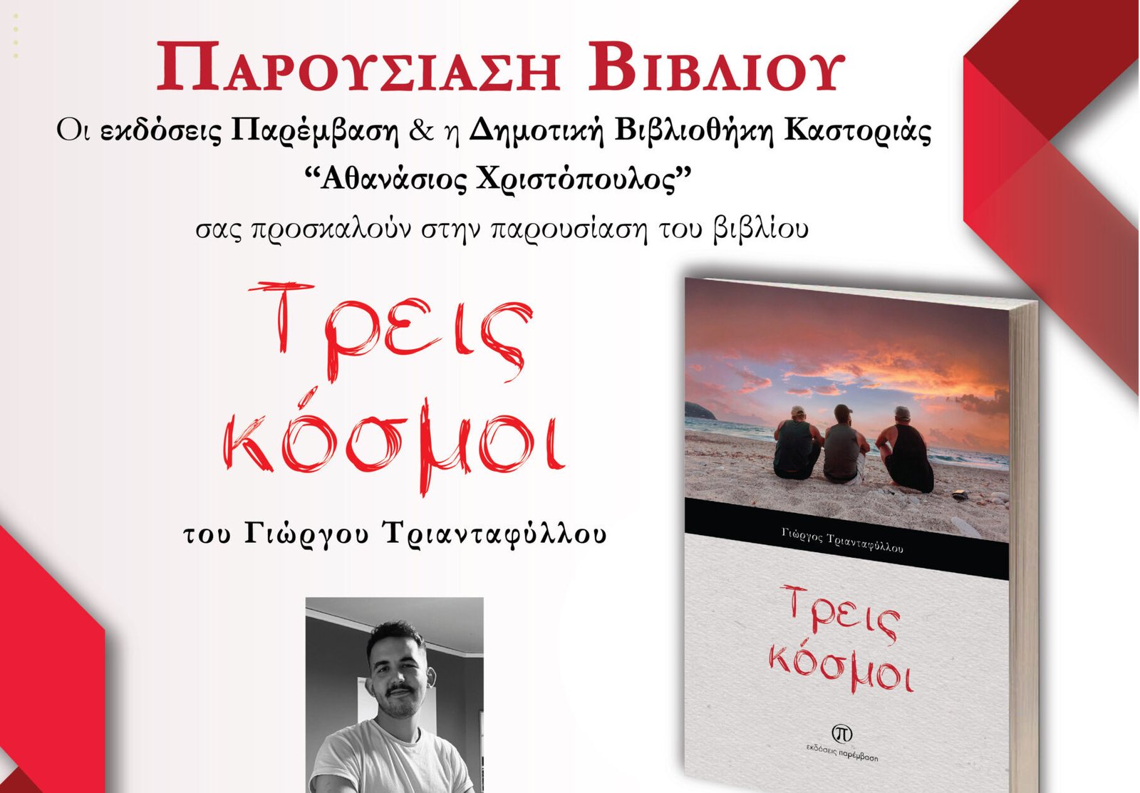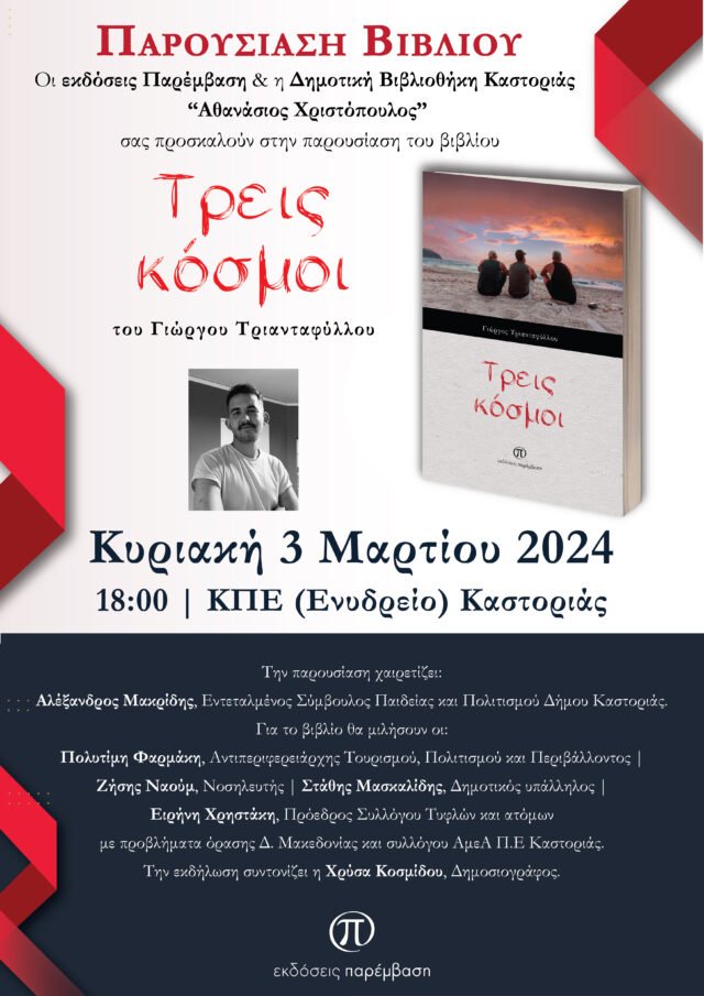 Παρουσίαση του βιβλίου «Τρεις κόσμοι» του Γιώργου Τριανταφύλλου από τις Εκδόσεις Παρέμβαση θα πραγματοποιηθεί την Κυριακή 3 Μαρτίου, στο ΚΠΕ (Ενυδρείο)Καστοριάς (Ζαλόγγου 3), στις 18:00.