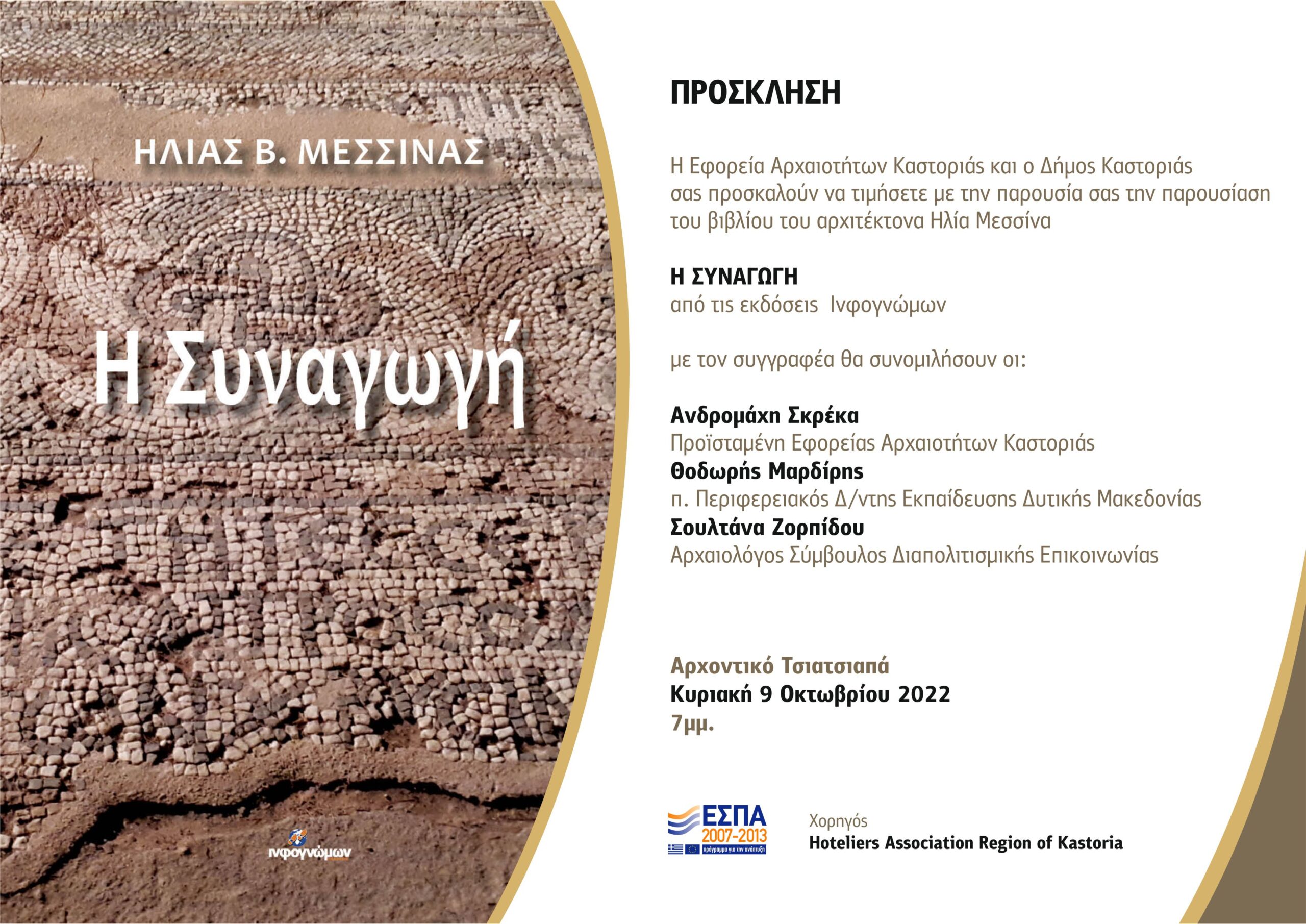 Η Εφορεία Αρχαιοτήτων Καστοριάς σε συνεργασία με τον Δήμο Καστοριάς σας προσκαλούν στην παρουσίαση του βιβλίου «Η Συναγωγή» από τις εκδόσεις Ινφογνώμων, του αρχιτέκτονα Ηλία Μεσσσίνα. Η εκδήλωση θα πραγματοποιηθεί στο Αρχοντικό Τσιατσιαπά, την Κυριακή 9 Οκτωβρίου 2022 και ώρα 7μμ.