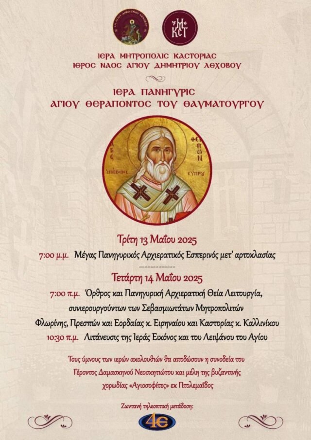 Πρόγραμμα Ιεράς Πανήγυρεως του Αγίου Θεράποντος Επισκόπου Κύπρου του Θαματουργού, στον Ιερό Ναό του Αγίου Δημητρίου Λεχόβου