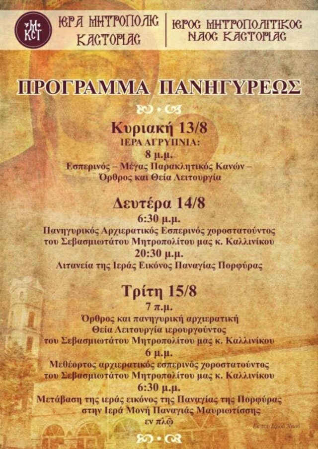 Πρόγραμμα πανηγύρεως Ιερού Μητροπολιτικού Ναού Καστοριάς