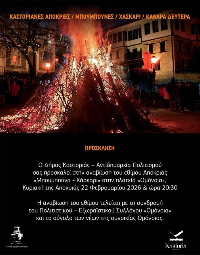 Ο Δήμος Καστοριάς – Αντιδημαρχία Πολιτισμού σας προσκαλεί στην αναβίωση του εθίμου Αποκριάς «Μπουμπούνα – Χάσκαρι» στην πλατεία «Ομόνοια» την Κυριακή της Αποκριάς 22 Φεβρουαρίου 2026 και ώρα 20:30.