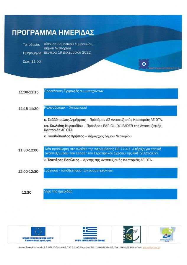 η Αναπτυξιακή Καστοριάς ΑΕ ΟΤΑ σας προσκαλεί σε εκδήλωση διαβούλευσης για την υποβολή πρότασης από την ΑΝΚΑΣ για την επιλογή Στρατηγικών Τοπικής Ανάπτυξης με πρωτοβουλία Τοπικών Κοινοτήτων, στο πλαίσιο της παρέμβασης Π3-77-4.1 «Στήριξη για τοπική ανάπτυξη μέσω του Leader του Στρατηγικού Σχεδίου της ΚΑΠ 2023-2027,