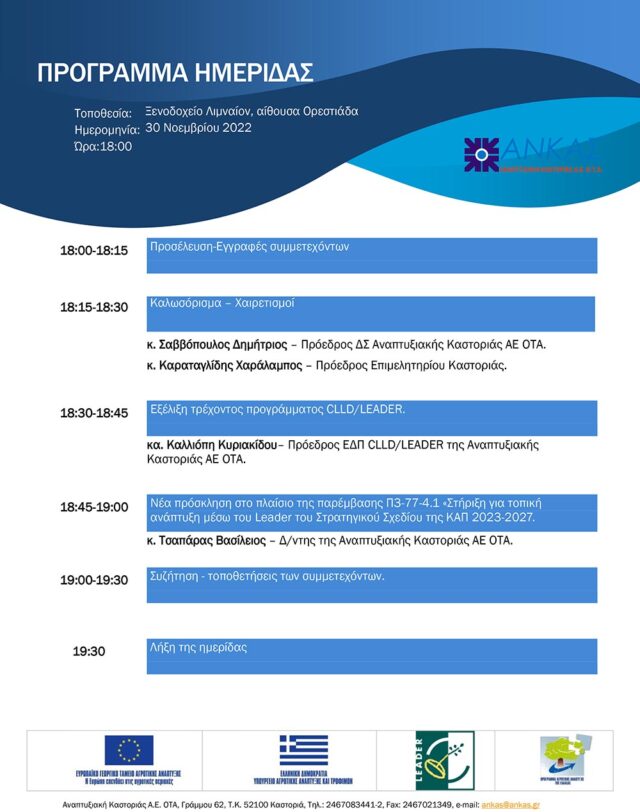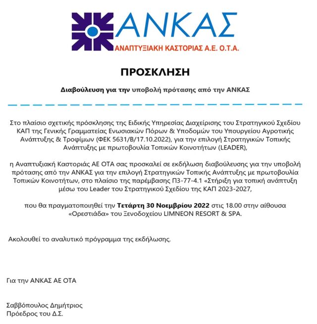Πρόσκληση σε εκδήλωση διαβούλευσης για την υποβολή πρότασης από την ΑΝΚΑΣ για την επιλογή στρατηγικών τοπικής ανάπτυξης