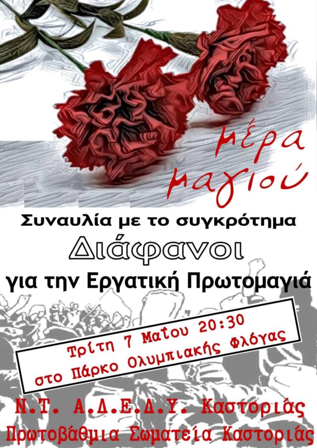 Ο Σύλλογος Εκπαιδευτικών Πρωτοβάθμιας Εκπαίδευσης Ν. Καστοριάς συνδιοργανώνειμε το Νομαρχιακό Τμήμα ΑΔΕΔΥ Καστοριάς και τα υπόλοιπα Πρωτοβάθμια Σωματεία του Ν. Καστοριάς μουσική εκδήλωση για την Εργατική Πρωτομαγιά την Τρίτη 07 Μαΐου 2024 και ώρα 20:30 στο Πάρκο Ολυμπιακής Φλόγας με το συγκρότημα «Διάφανοι».