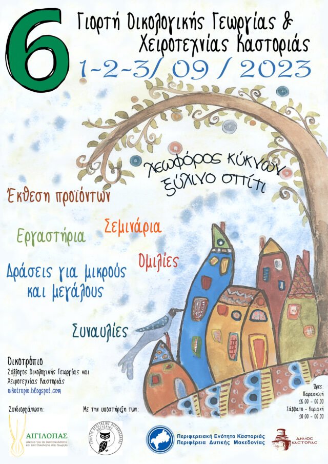Το «Οικοτρόπιο» ο Σύλλογος Οικολογικής Γεωργίας και Χειροτεχνίας Καστοριάς, σας καλεί στην 6η Γιορτή Οικολογικής Γεωργίας και Χειροτεχνίας Καστοριάς που θα πραγματοποιηθεί στις 1-3 Σεπτέμβρη 2023 στο Ξύλινο Σπίτι (Λεωφ. Κύκνων), στην είσοδο της πόλης.