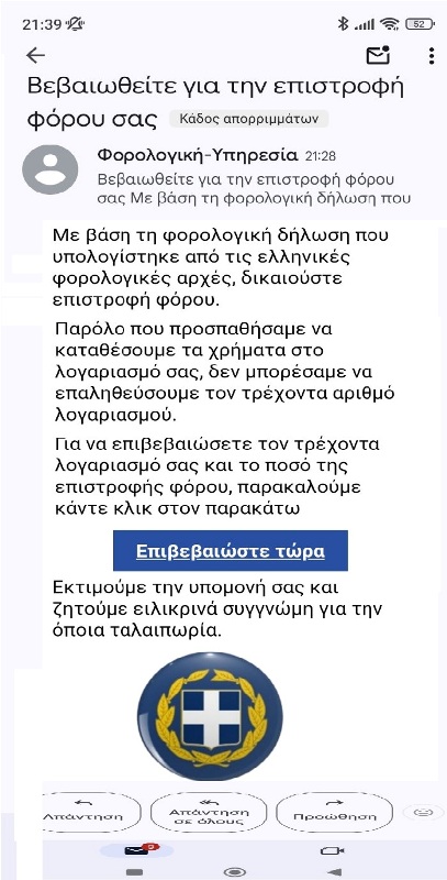 Χθες το βράδυ έλαβα αυτό το email. Οι προσπάθειες απάτης είναι σε έξαρση. Δεν απαντάμε σε περίεργα τηλέφωνα, μηνύματα και e-mail. Και το βασικότερο δεν κάνουμε κλικ σε συνδέσμους.