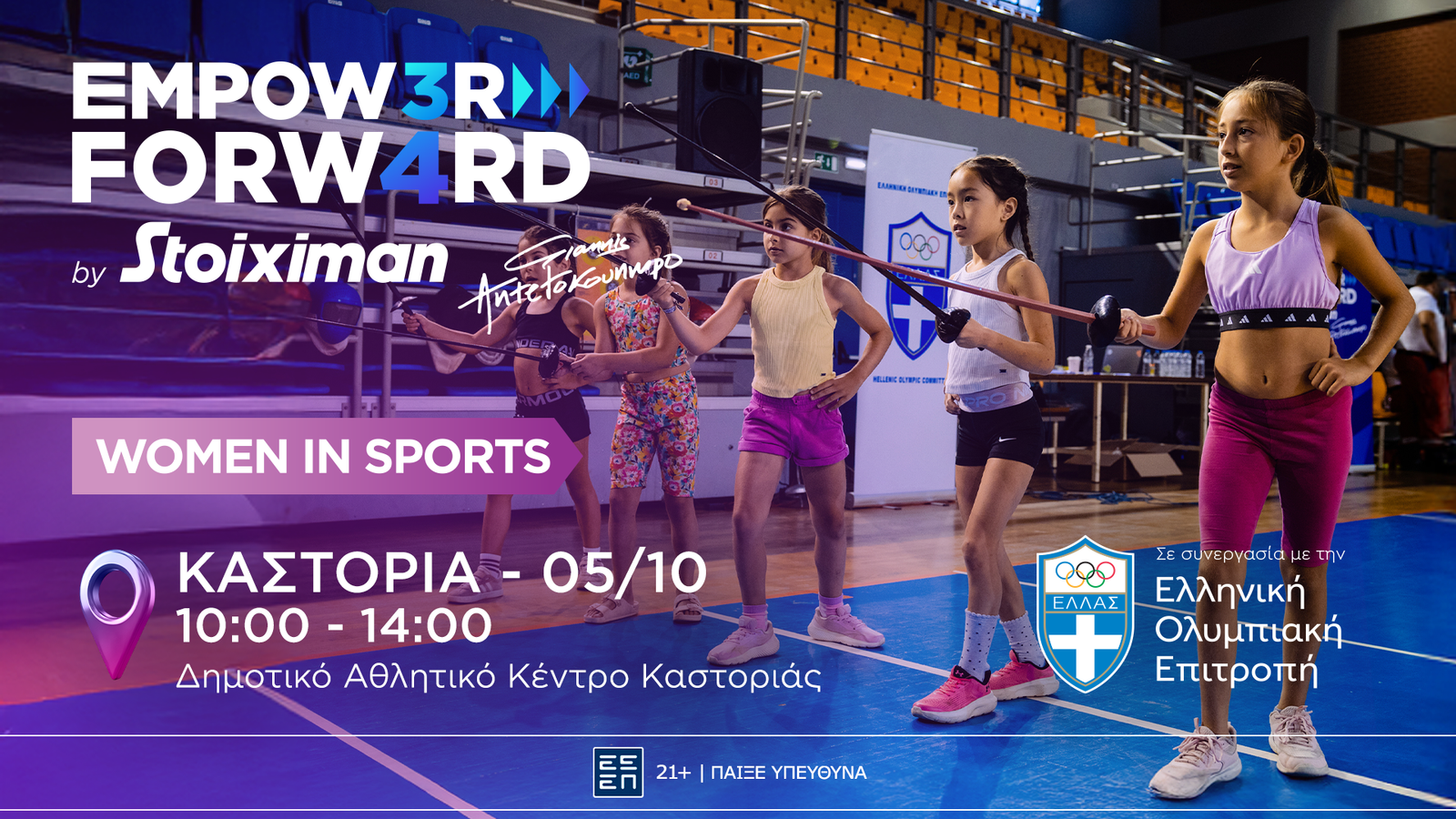 Το Empower Forward – Women in Sports, το πρόγραμμα εταιρικής υπευθυνότητας της Stoiximan με πρεσβευτή τον Γιάννη Αντετοκούνμπο και σε συνεργασία με την Ελληνική Ολυμπιακή Επιτροπή, συνεχίζει τη δυναμική του πορεία σε όλη τη χώρα, δίνοντας την ευκαιρία σε γυναίκες και κορίτσια να γνωρίσουν από κοντά τη δύναμη και τη χαρά του αθλητισμού. Μετά τις δυναμικές στάσεις σε Ιωάννινα, Ρόδο, Καλαμάτα, Χανιά, Μυτιλήνη και Σέρρες, η μεγάλη γιορτή του αθλητισμού ταξιδεύει στην Καστοριά, την Κυριακή 5 Οκτωβρίου, για να προσκαλέσει κορίτσια και γυναίκες ηλικίας 7 έως 77 ετών σε μια μοναδική εμπειρία συμμετοχής, άθλησης και έμπνευσης.