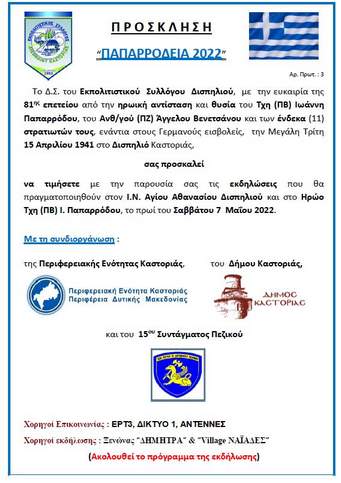 Το πρωί του Σαββάτου 7/5/2022, ο Εκπολιτιστικός Σύλλογος Δισπηλιού (σύμφωνα με το συνημμένο πρόγραμμα) τιμά και φέτος με την εκδήλωσή του “ΠΑΠΑΡΡΟΔΕΙΑ 2022” την μνήμη των των δεκατριών (13) ηρωικώς πεσόντων ελλήνων αξιωματικών και στρατιωτών την 15η Απριλίου 1941 στη μάχη του Δισπηλιού, ενάντια στους Γερμανούς εισβολείς. Φέτος θα έχουμε τη μεγάλη τιμή να χοροστατήσουν στο Αρχιερατικό Συλλείτουργο και στο Μνημόσυνο στον Ι.Ν. Αγίου Αθανασίου Δισπηλιού, ο Σεβασμιώτατος Μητροπολίτης της Ι.Μ. Φθιώτιδας κ.κ. Συμεών και ο οικείος Μητροπολίτης κ.κ. Καλλίνικος. Επίσης, θα παραστούν η πολιτική και πολιτειακή ηγεσία όχι μόνο του τόπου μας αλλά και της Φθιώτιδας και της Στερεάς Ελλάδας, η ηγεσία του 15ου Σ.Π. Καστοριάς, και για πρώτη φορά οι άμεσοι απόγονοι των ηρώων Τχη (ΠΒ) Ιωάννη Παπαρρόδου και Ανθγού (ΠΖ) Άγγελου Βενετσάνου καθώς και λεωφορεία προσκυνητών από την Αθήνα και την Υπάτη Λαμίας.