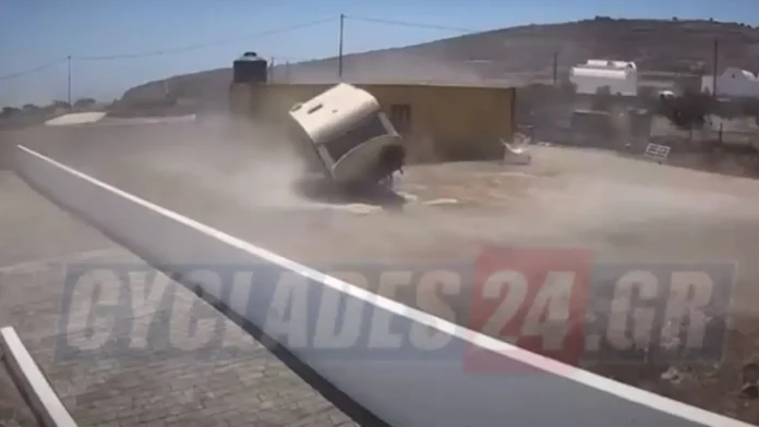 Το εντυπωσιακό αλλά και επικίνδυνο περιστατικό σημειώθηκε το μεσημέρι της Παρασκευής (27.06.2025) στο Εμπορείο στη Σαντορίνη, όταν οι ισχυρές ριπές ανέμου σήκωσαν κυριολεκτικά από το έδαφος ένα τροχόσπιτο, παρασύροντάς το αρκετά μέτρα μακριά. Το όχημα περιστράφηκε γύρω από τον άξονά του, πριν καταλήξει πλήρως κατεστραμμένο σε διπλανό σημείο.