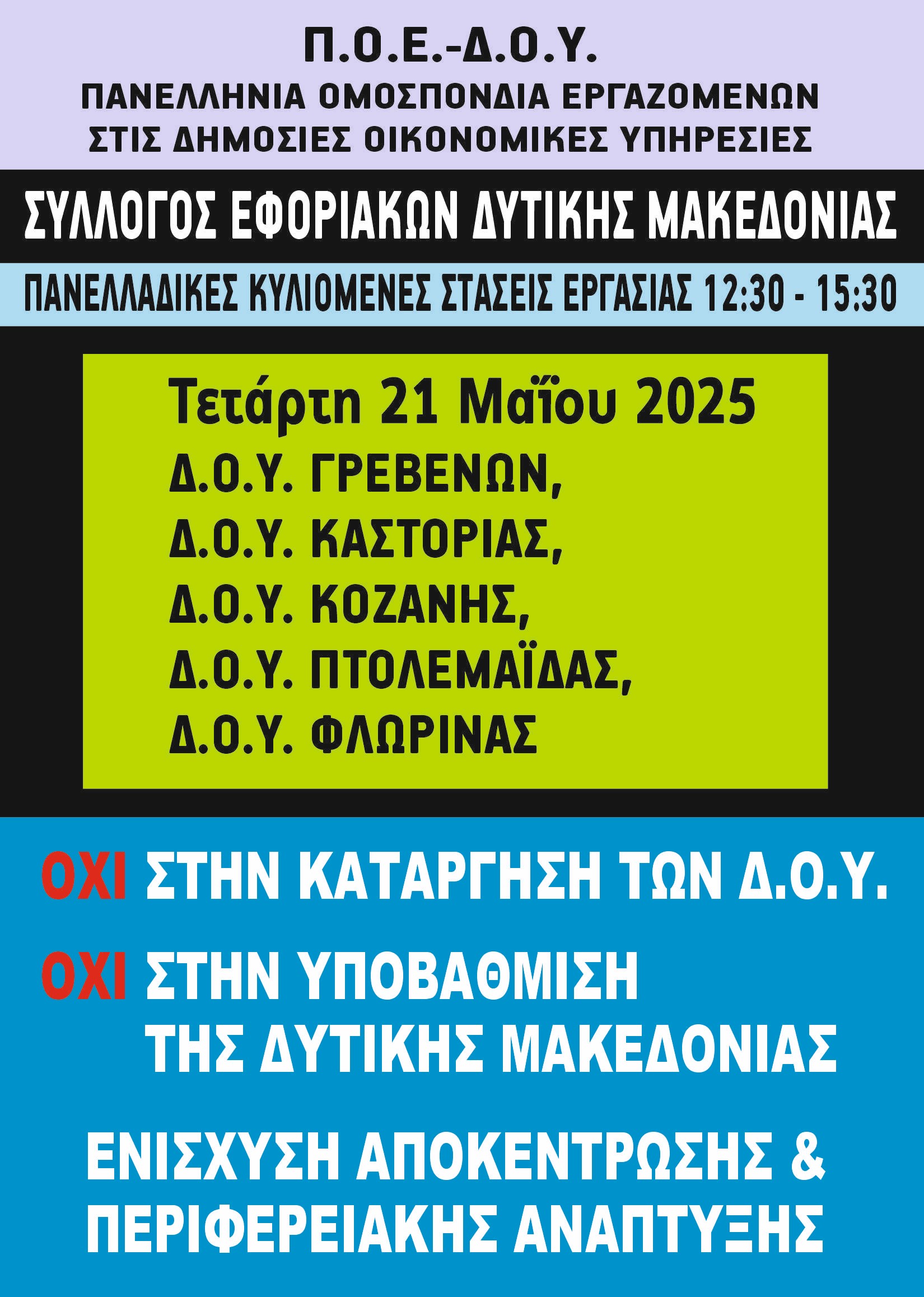 Στάση εργασίας των εφοριακών Δυτικής Μακεδονίας αύριο Τετάρτη 21/5