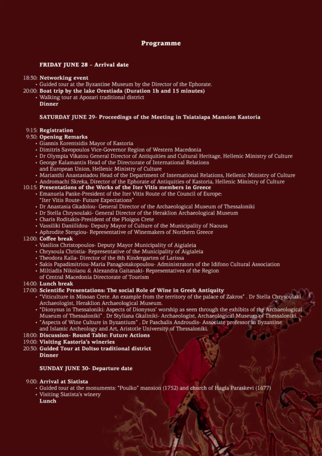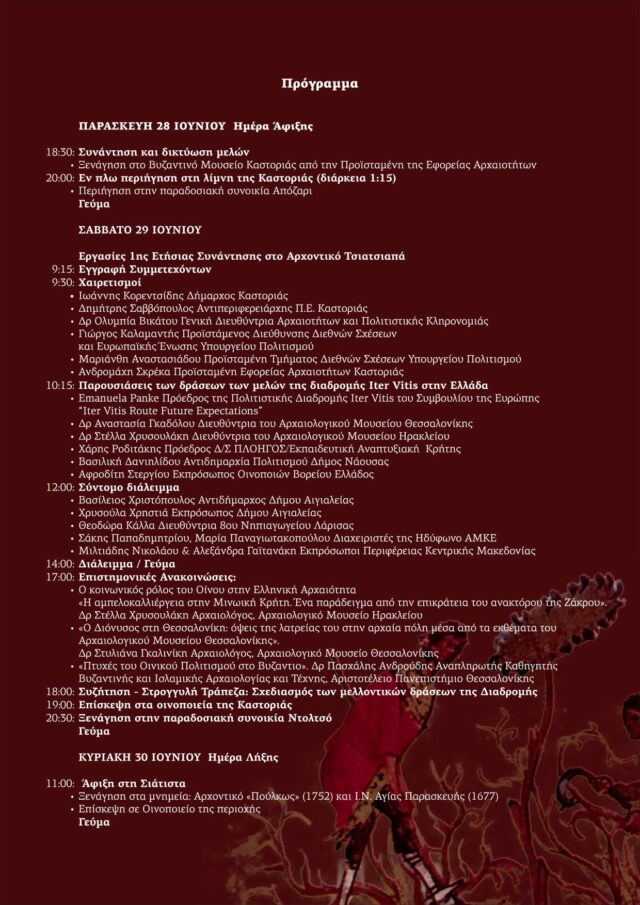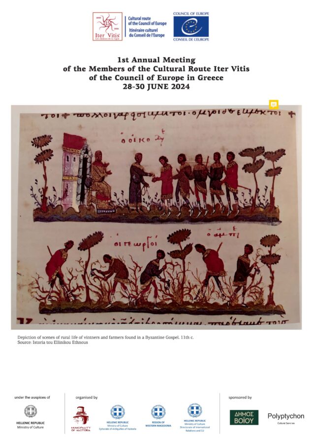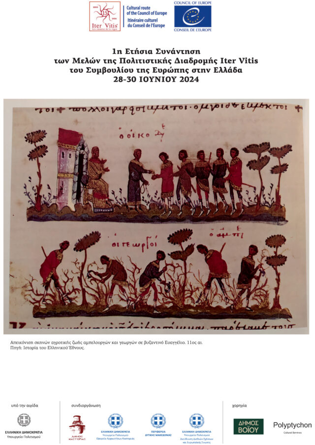Ο Δήμος Καστοριάς, ενταγμένος από το 2023 στην Πολιτιστική Διαδρομή «Iter Vitis» (Δρόμοι του Κρασιού) του Συμβουλίου της Ευρώπης σε συνεργασία με την Εφορεία Αρχαιοτήτων Καστοριάς και τη Διεύθυνση Διεθνών Σχέσεων & Ευρωπαϊκής Ένωσης του Υπουργείου Πολιτισμού, διοργανώνουν στις 28,29 και 30 Ιουνίου 2024 την 1η Ετήσια Συνάντηση των μελών της ελληνικής διαδρομής.